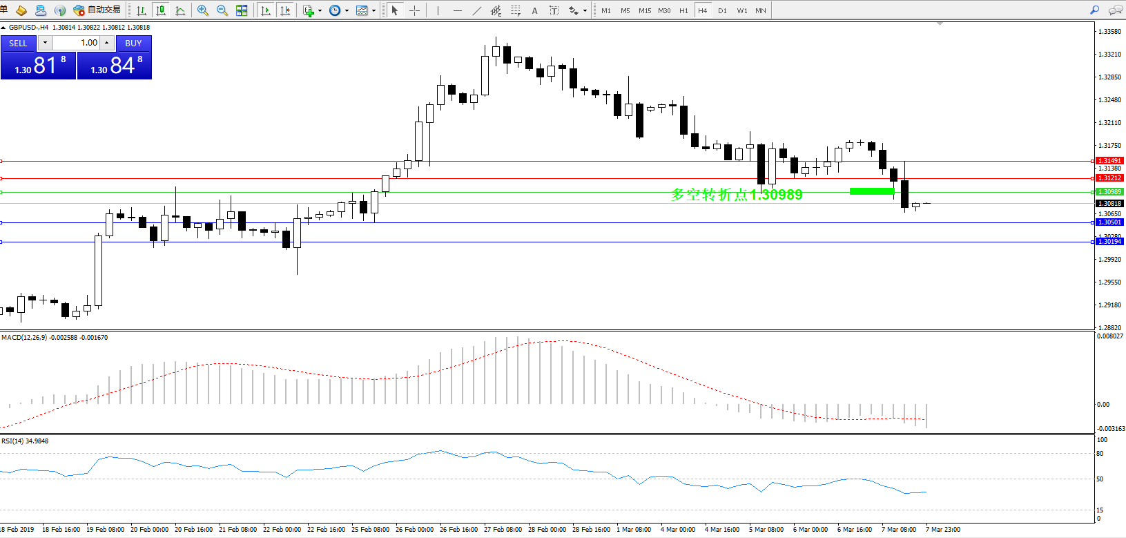 交易策略:1.30989下方看跌,目标1.30501、1.30194