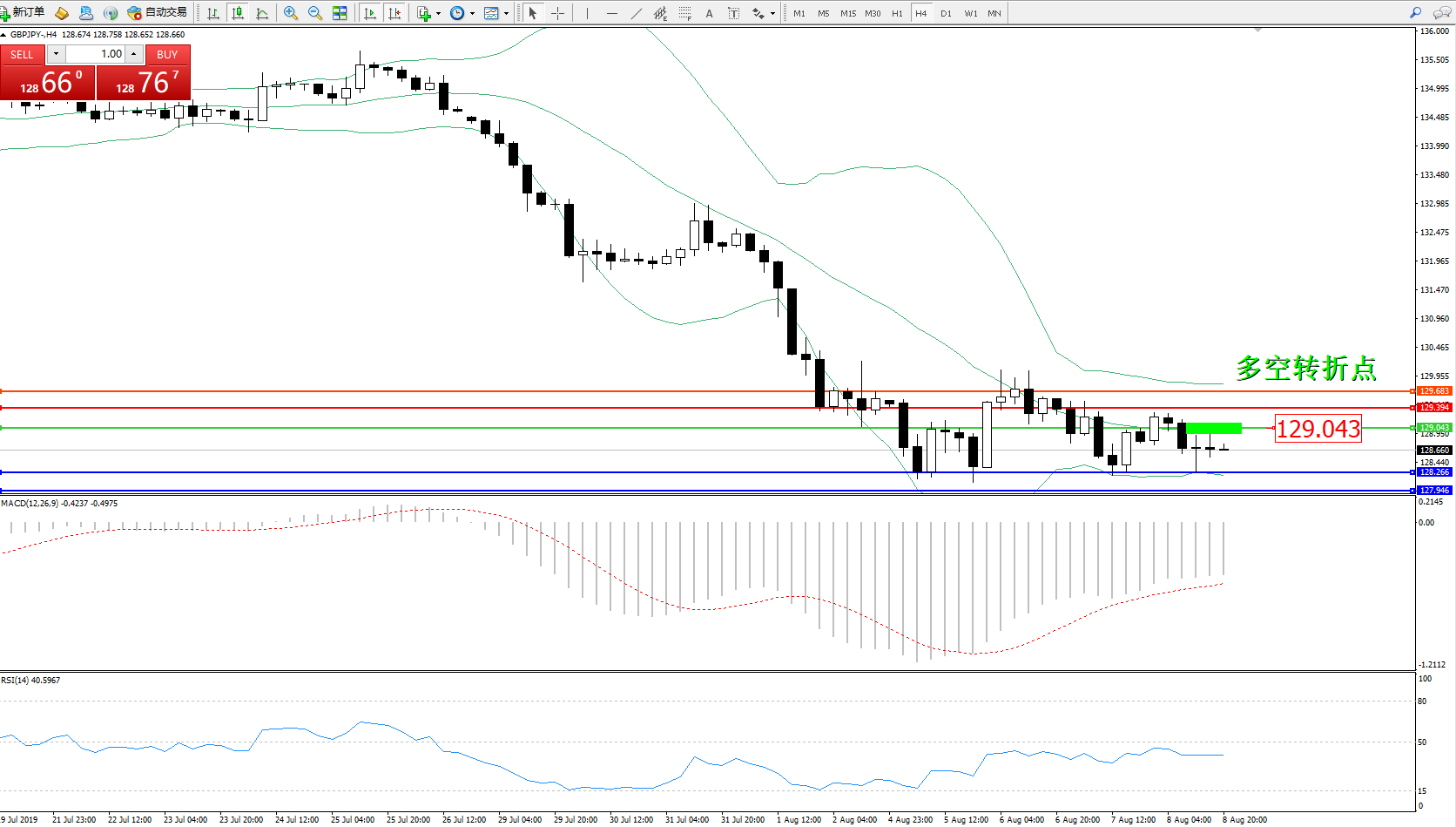 交易策略:129.043下方看跌,目标128.266、127.946
