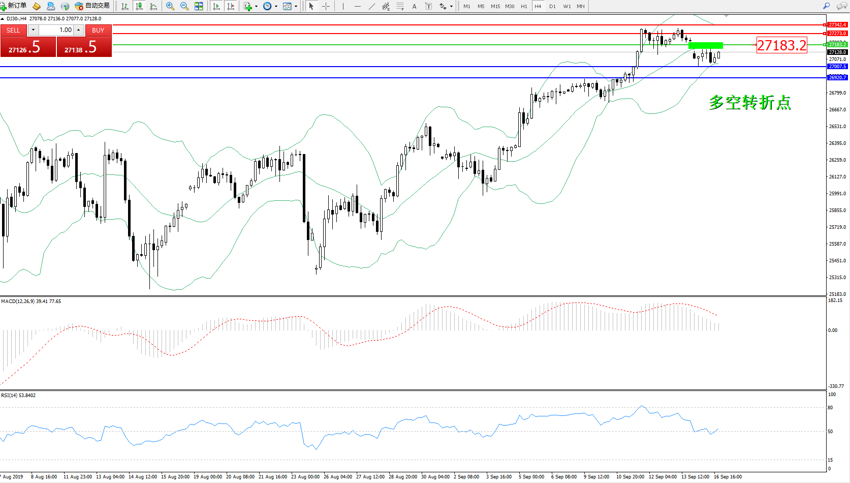 道琼斯指数DJ30—— 4小时K线图显示: