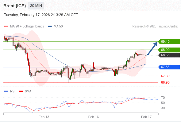 在 67.85 之上,看涨,目标价位为 68.90 ,然后为 69.40 。