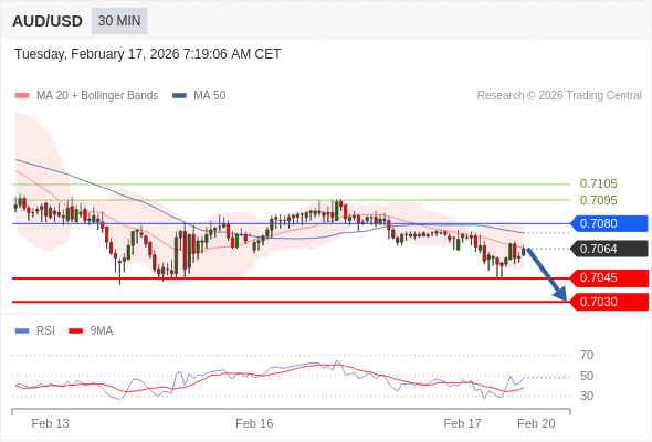 交易策略: 在 0.7080 之下,看跌,目标价位为 0.7045 ,然后为 0.7030 。