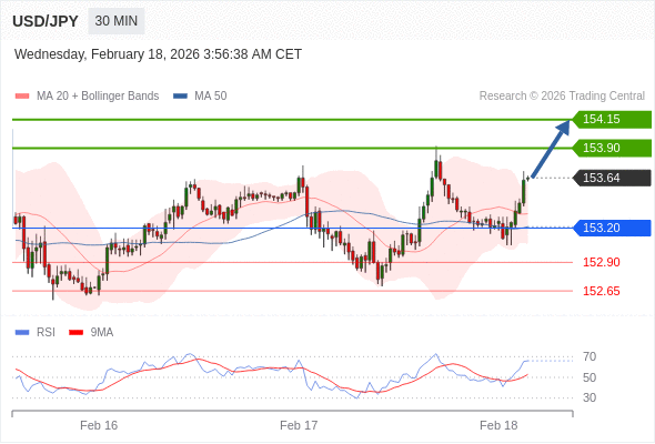 在 153.20 之上,看涨,目标价位为 153.90 ,然后为 154.15 。