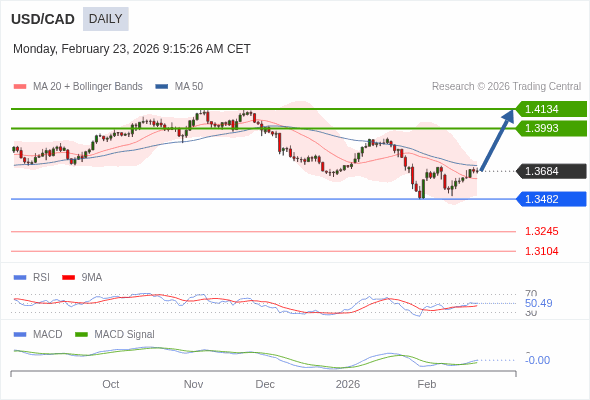 技术点评: RSI技术指标大于中性区域50。 MACD技术指标处在其信号线之上看空。 MACD必须突破其零位,才能触发进一步的上涨。 另外,价位低于其50天移动平均线 (1.3724 ) 但高于其20天移动平均线 (1.3629 )。