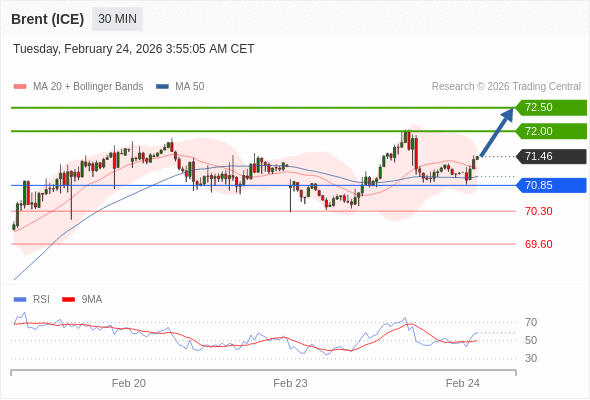 在 70.85 之上,看涨,目标价位为 72.00 ,然后为 72.50 。