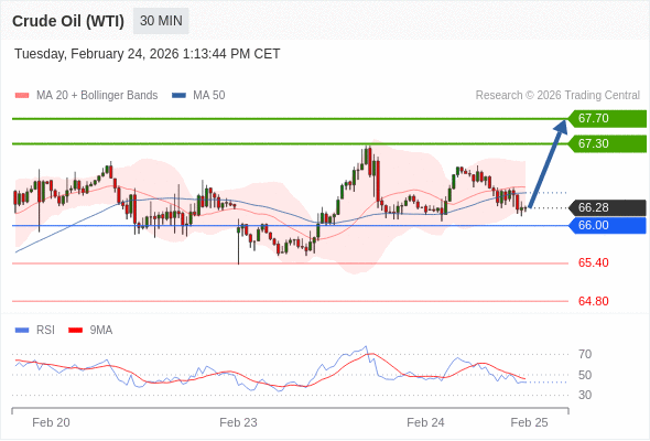 在 66.00 之上,看涨,目标价位为 67.30 ,然后为 67.70 。