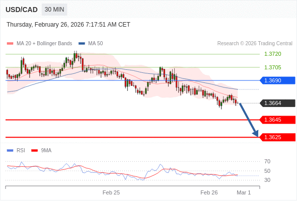 在 1.3690 之下,看跌,目标价位为 1.3645 ,然后为 1.3625 。