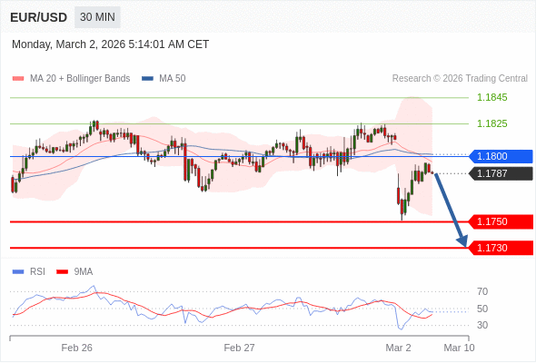 在 1.1800 之下,看跌,目标价位为 1.1750 ,然后为 1.1730 。