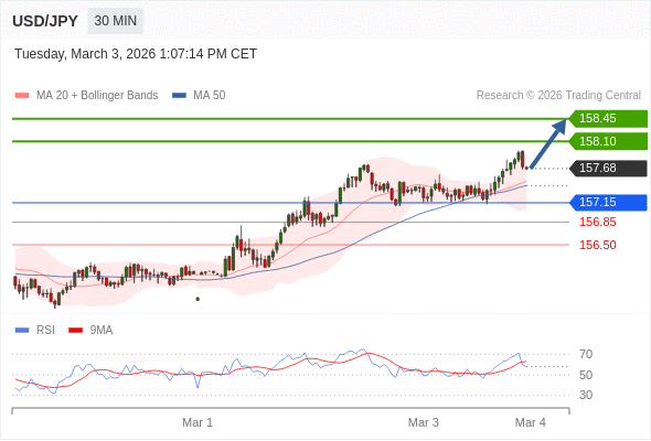 在 157.15 之上,看涨,目标价位为 158.10 ,然后为 158.45 。