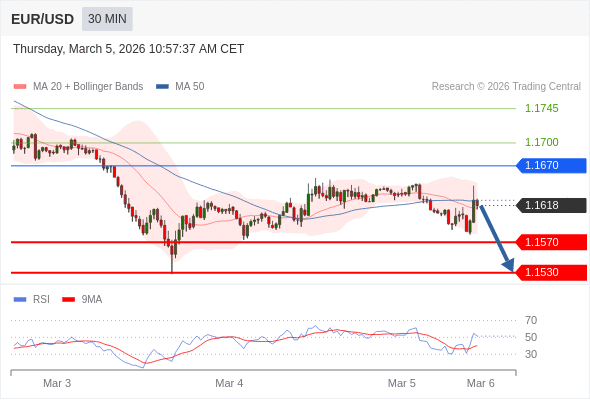 交易策略: 在 1.1670 之下,看跌,目标价位为 1.1570 ,然后为 1.1550 。