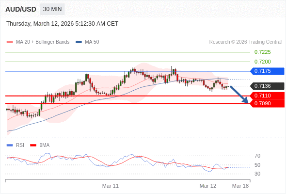 交易策略: 在 0.7175 之下,看跌,目标价位为 0.7110 ,然后为 0.7090 。