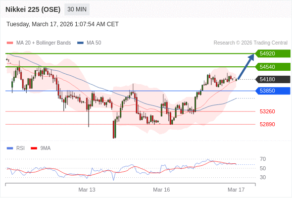 在 53850 之上,看涨,目标价位为 54540 ,然后为 54920 。