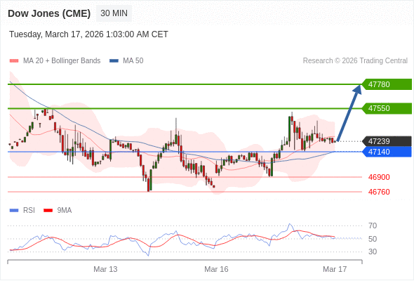 在 47140 之上,看涨,目标价位为 47550 ,然后为 47780 。