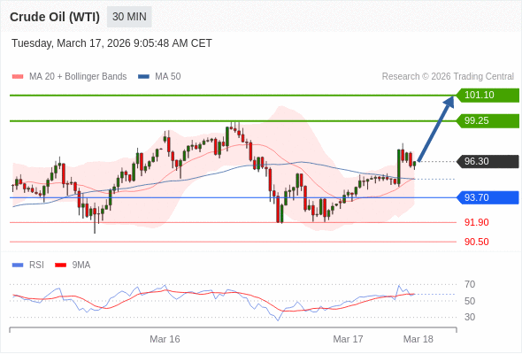 在 93.70 之上,看涨,目标价位为 99.25 ,然后为 101.10 。
