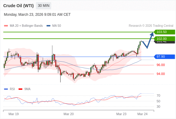 在 97.90 之上,看涨,目标价位为 102.00 ,然后为 103.50 。