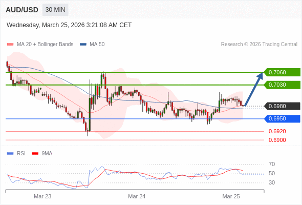 在 0.6950 之上,看涨,目标价位为 0.7030 ,然后为 0.7060 。