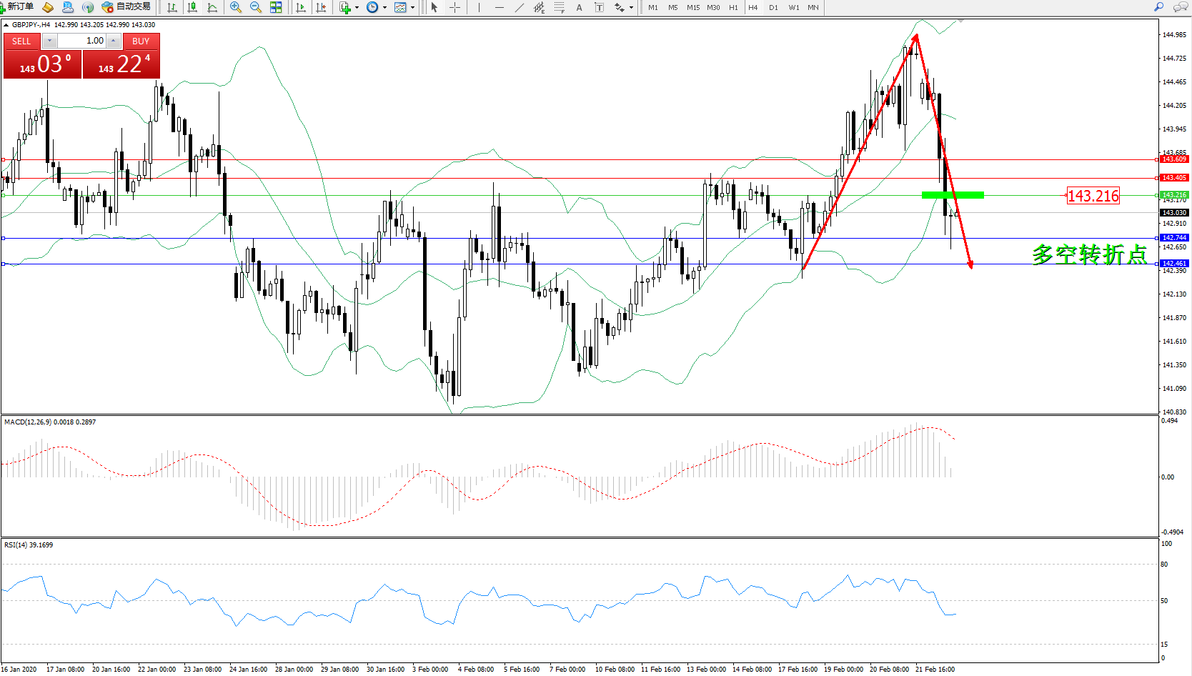 交易策略:143.216下方看跌,目标142.744142.461