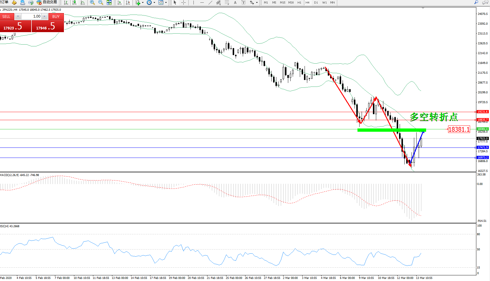 日经225指数313日(周五)收盘下跌1117.13点,跌幅6.02%,报17442.50点。日内全球金融市场恐慌情绪有所降温,更多央行加入到宽松行动中来,同时多国也表示进一步的维稳经济,日本央行进行计划外公开市场操作,为证券方面提供1.5万亿日元的流动性,并招标买入2000亿日元的日本债券;这是为了抑制收益率上升,并为市场提供流动性,在黑田东彦表示日本央行将毫不犹豫采取行动后,杠杆资金对美元兑日元空头回补。在欧洲交易时段,报道称日本央行下周会议上可能扩大刺激措施,旨在限制疫情的打击并安抚波动的市场。