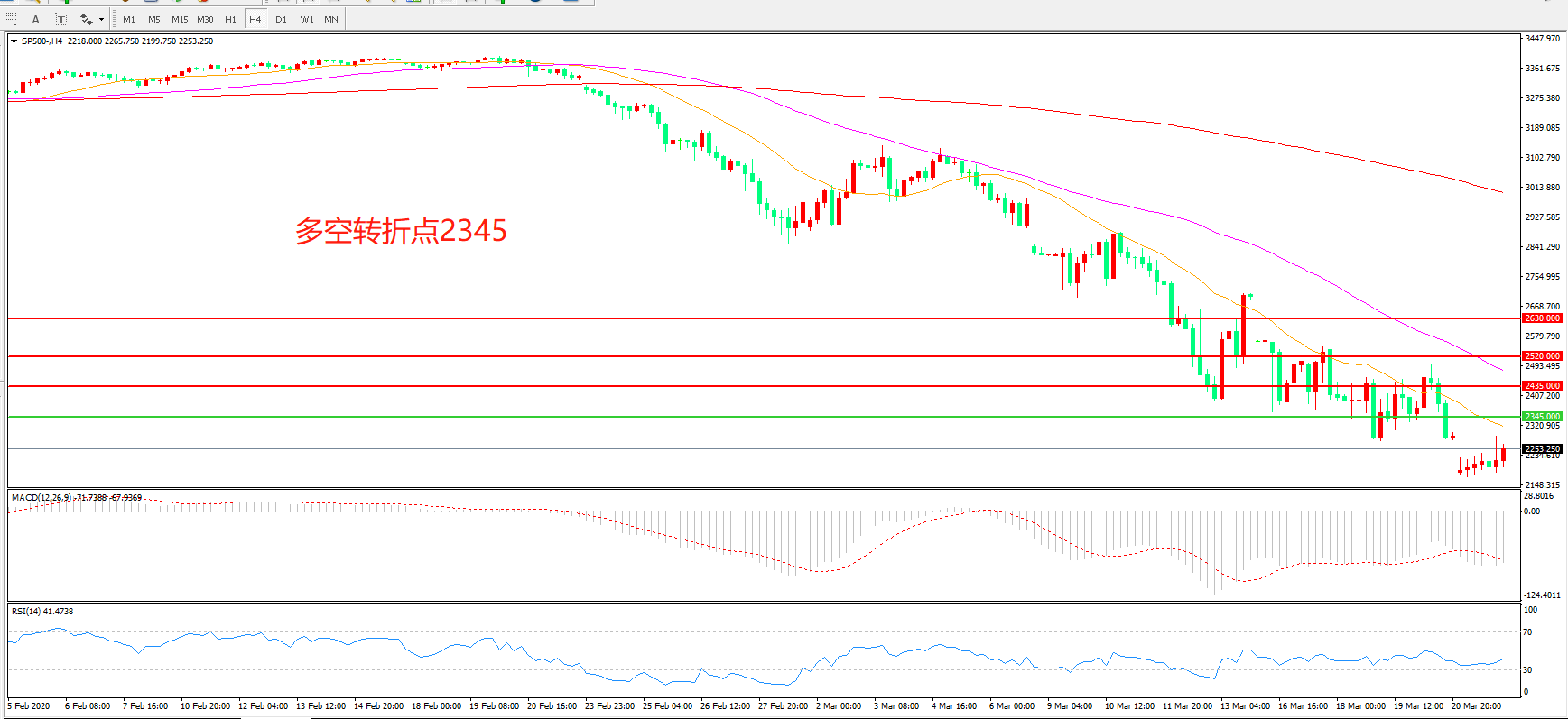 4小时图看,标普500冲高回落,整体表现仍旧十分低迷,均线系统呈空头排列,MACD绿柱增加,RSI指标走平,日内震荡下行较大。