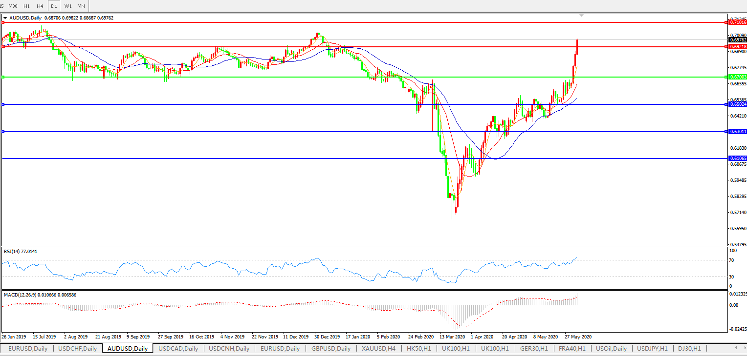 技术面简析:日图均线呈有序多头排列,汇价持续走高冲击0.70关口,MACD运行于0轴上方且量能快速放量,RSI持续走升,预计汇价大概率将进一步上行。