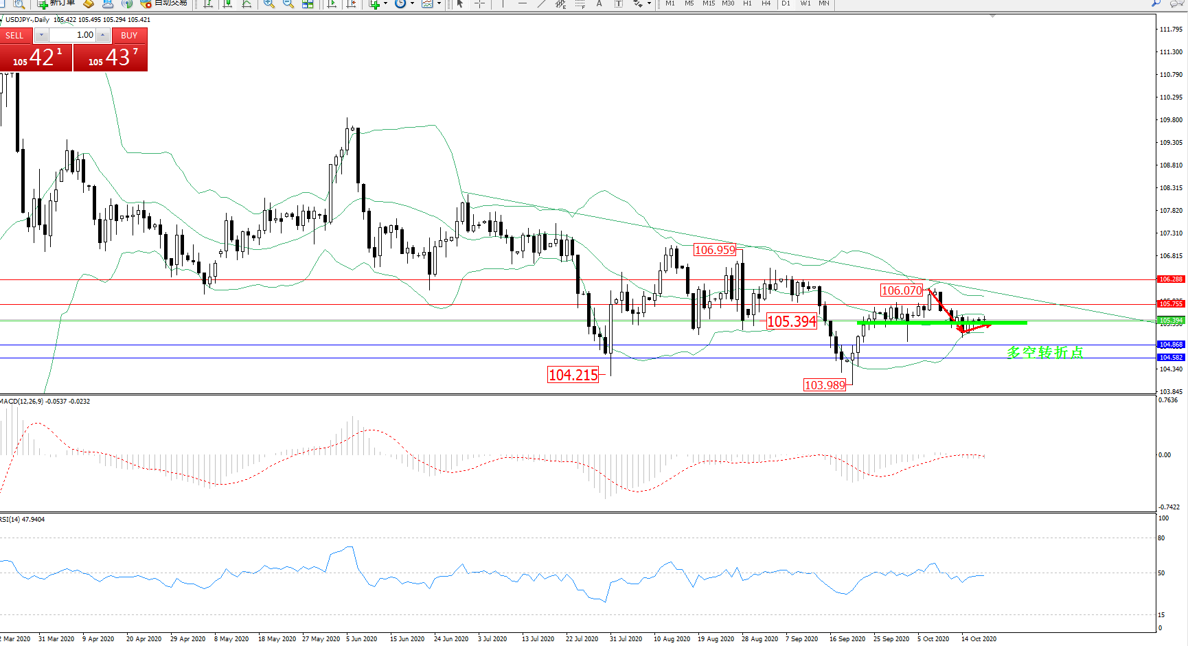 美元兑日圆纠结于105.420附近,日内美元指数大幅承压,但日元也并没有表现出持续走高态势,因市场并无太多避险需求,疫情形势严峻但料对经济冲击有限,而美国白宫办公厅主任梅多斯表示,可以在48小时内就救助达成有希望的协议,也令市场不确定性下降,投资者的焦点将是美国大选。新冠疫情在欧洲重燃提高了经济二次衰退并进入长期低迷的可能性,经济成长放缓意味着我们未来将见到更多货币及财政刺激。欧洲和美国第二波疫情在发展,在疫苗还未出现的情况下,如何控制住疫情将是经济复苏的重要条件。在全球一些地区疫情继续大举发展的情况下,经济复苏将放缓,这对日圆这种避险资产是利好的。
