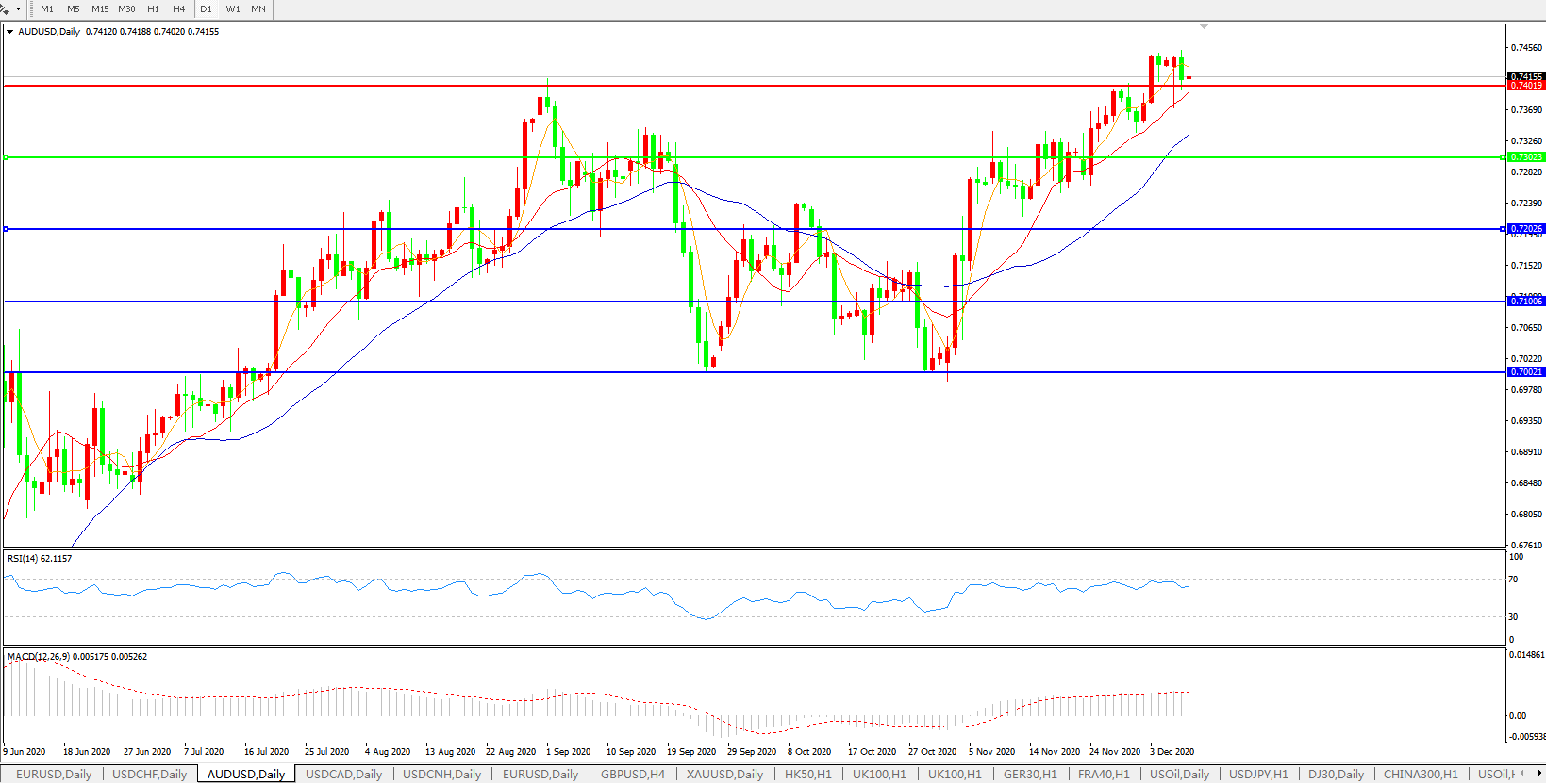 交易策略:0.7300上方看涨,目标0.7400、0.7500