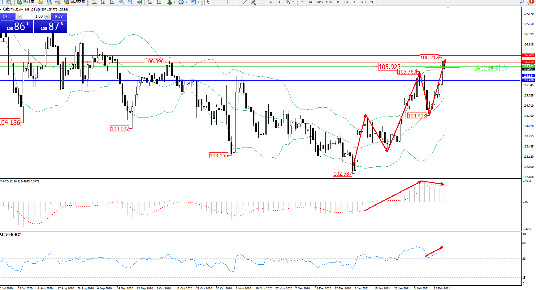 技术点评:多头动力维持在布林带指标通道中上轨区间持续震荡上扬,突破布林带指标上轨附近节点抵达106.212附近后短暂遇阻回撤整理,布林带指标上轨附近节点有破位在即,布林带指标呈收口走势后持续向上移动中,多头动力有进一步向上移动态势,MACD指标处于多头区域高位整理平移中,RSI指标处于50均衡线上方持续震荡向上移动中;