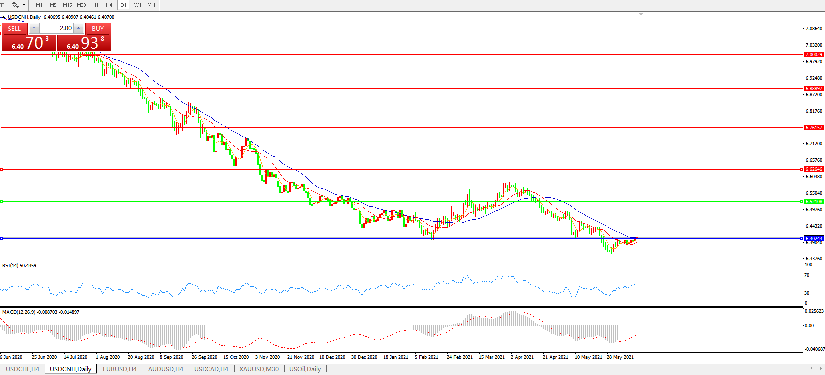 备选策略: 在6.5200之上,看涨,目标价位为6.6270,然后为6.7615。