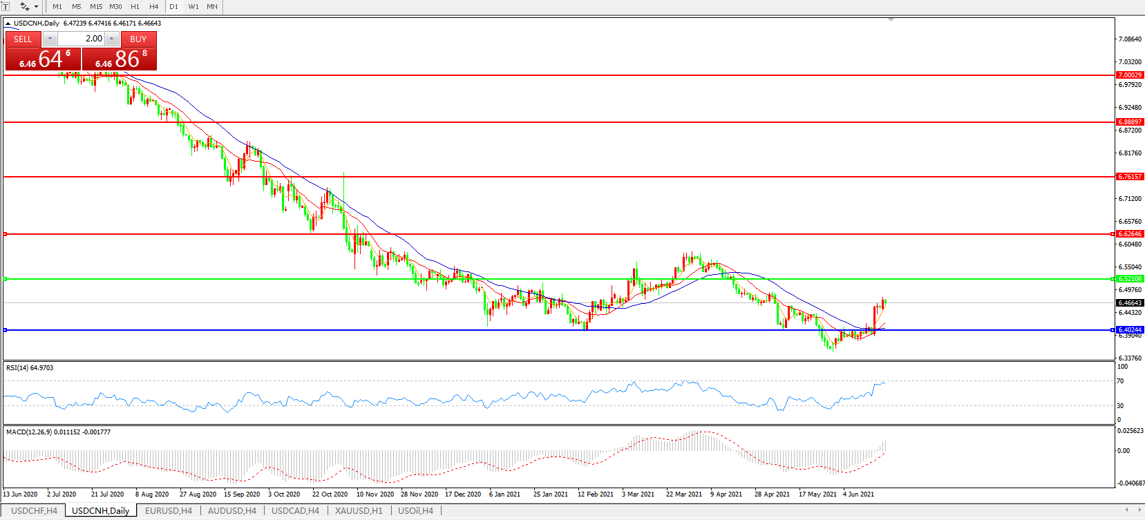 备选策略: 在6.5200之上,看涨,目标价位为6.6270,然后为6.7615。