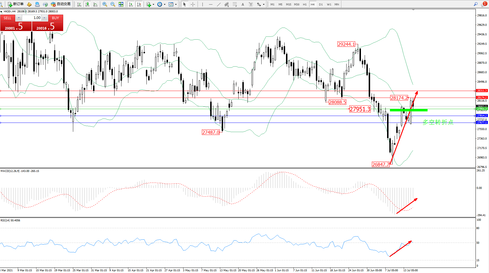 恒指HK50 ——4小时K线图显示: