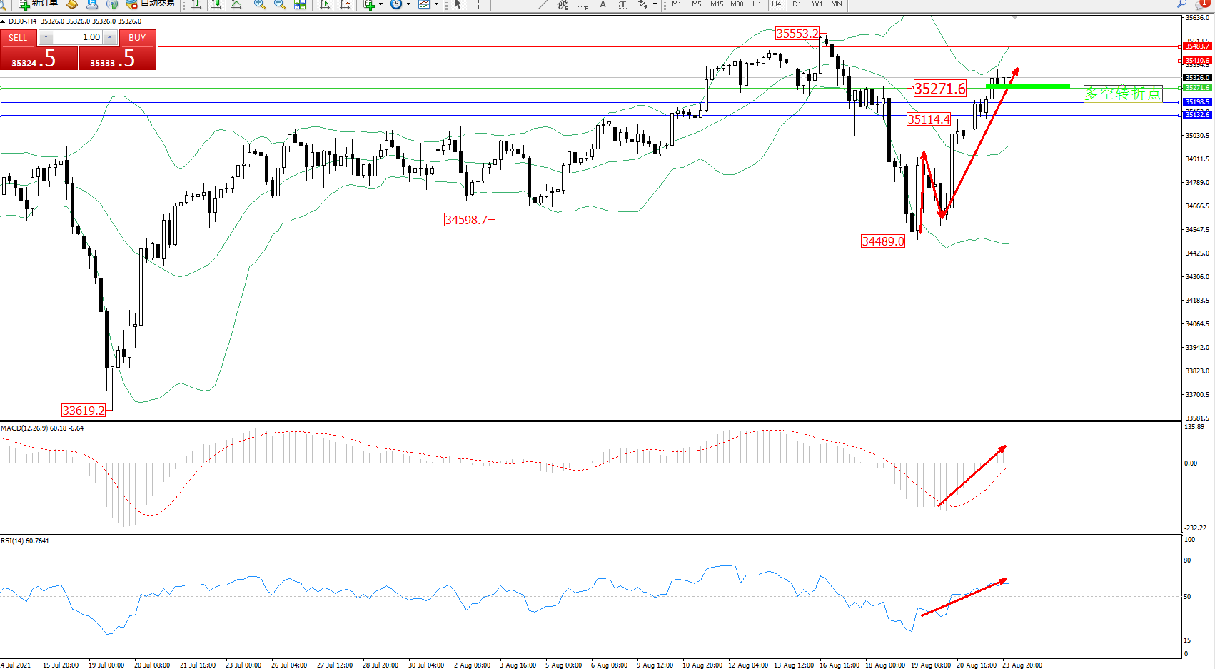 道琼斯指数DJ30——4小时K线图显示: