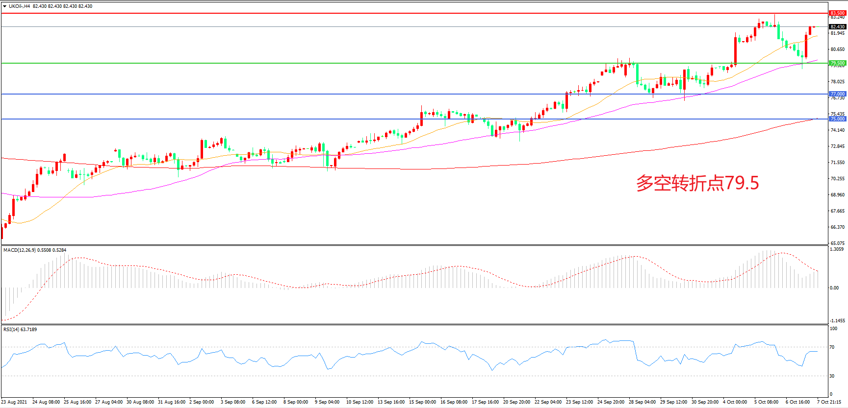 4小时图看,油价触碰83.5美元附近后小幅回落,上行趋势依然完好,均线系统呈多头排列,MACD红柱缩短,RSI指标走平,日内震荡上行概率较大。