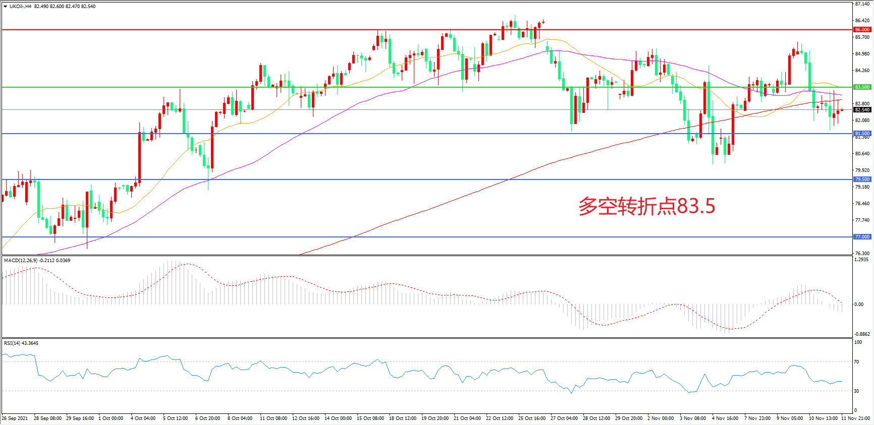4小时图看,油价破位大跌后延续宽幅震荡,短期跌势暂缓,均线系统成为阻力,83.5成为多空分水岭,MACD绿柱增加,RSI指标走平,日内延续震荡概率较大。