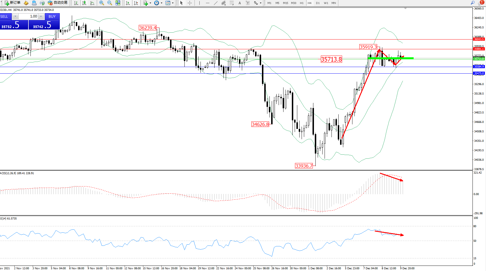 道琼斯指数DJ30——4小时K线图显示: