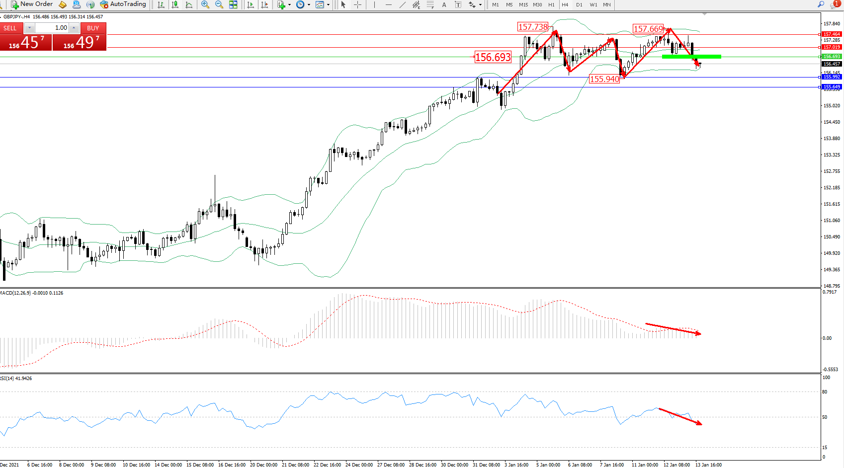 交易策略:156.693下方看跌,目标155.992、155.649