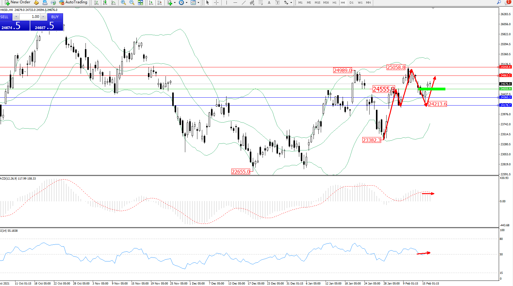 恒指HK50 ——4小时K线图显示: