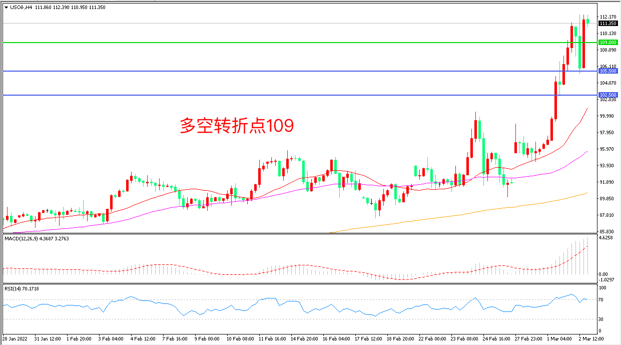 周三(3月2日),尽管油价最近高涨,但沙特和俄罗斯等OPEC仍决定保持当前的一个月增产40万桶/日步伐不变。油价在俄乌局势激发的供应担忧刺激下大幅走高,美国WTI原油延续疯狂表现,收报111.35美元/桶,目前原油市场处于“自我强化”的非理性上涨阶段,市场不确定性较高,谨慎追多。