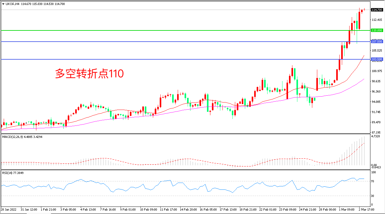 周三(3月2日),尽管油价最近高涨,但沙特和俄罗斯等OPEC仍决定保持当前的一个月增产40万桶/日步伐不变。油价在俄乌局势激发的供应担忧刺激下大幅走高,布伦特原油延续疯狂表现,收报114.78美元/桶,目前原油市场处于“自我强化”的非理性上涨阶段,市场不确定性较高,谨慎追多。