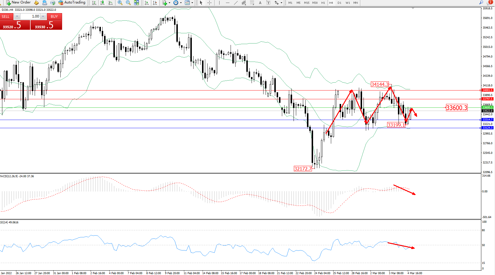 交易策略:33600下方看跌,目标33314、33124