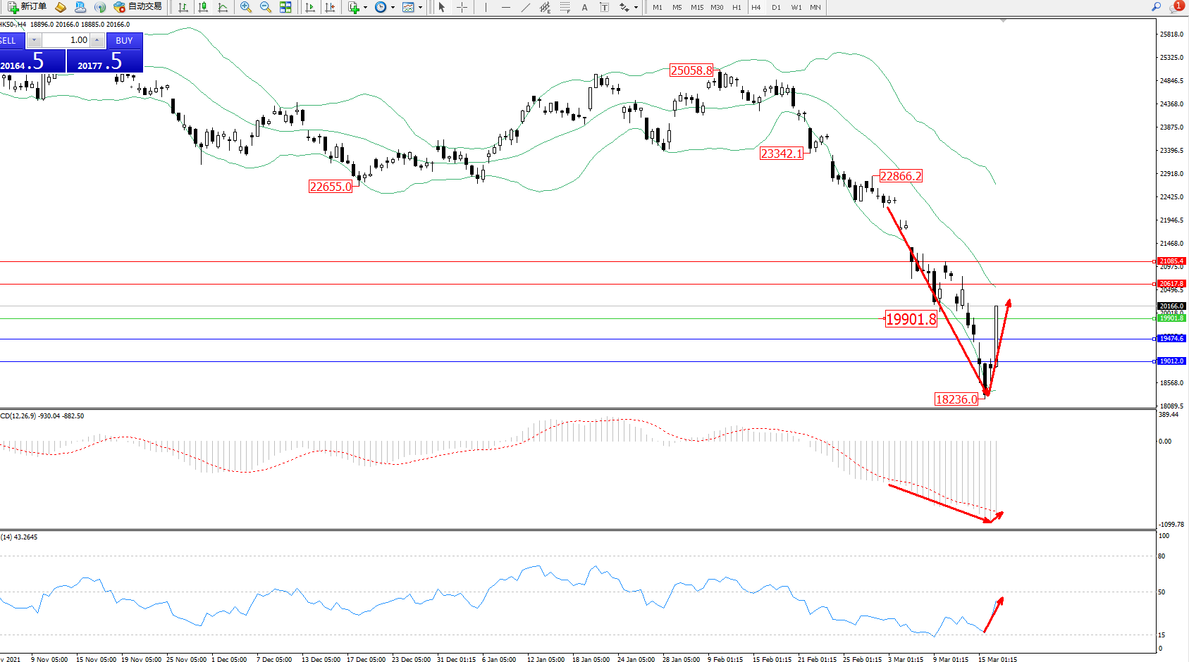 恒指HK50 ——4小时K线图显示: