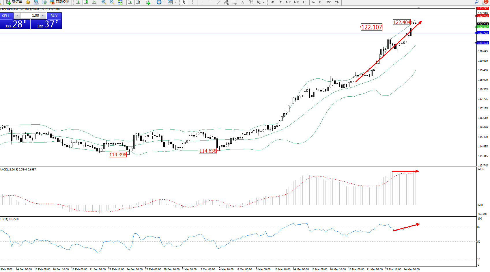 交易策略:122.107上方看涨,目标122.773、123.227