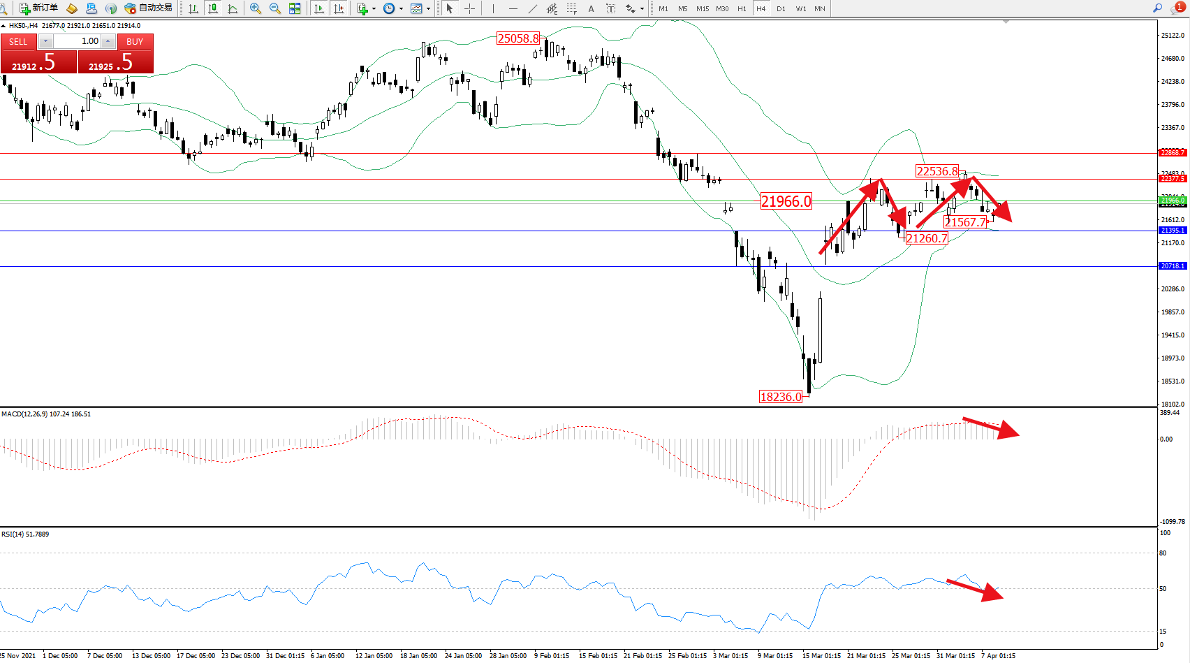 恒指HK50 ——4小时K线图显示: