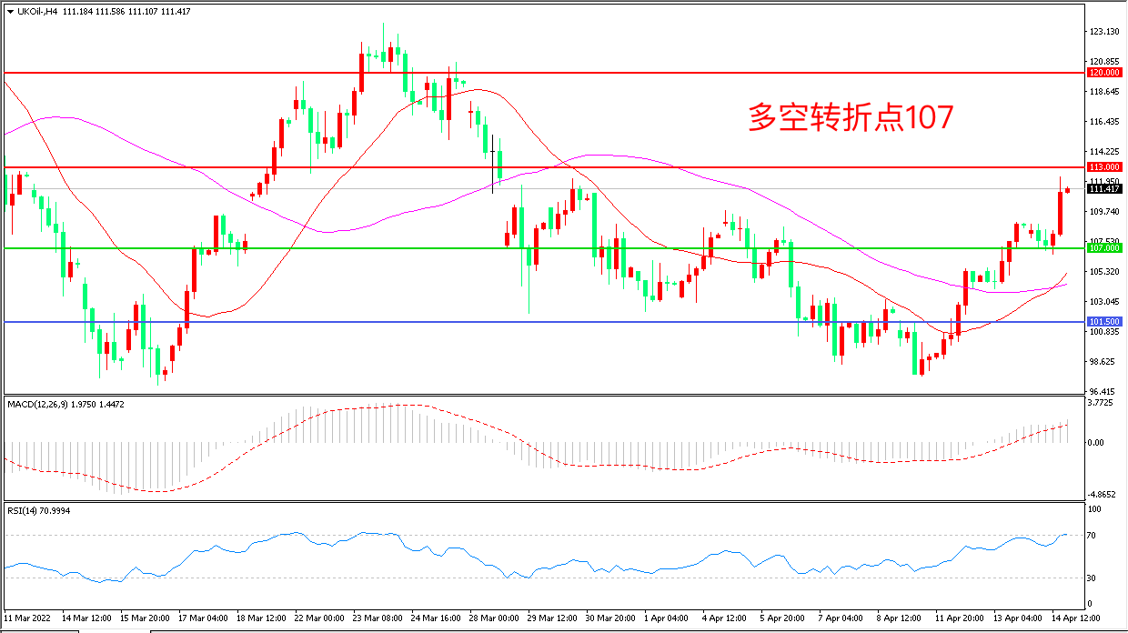 4小时图看,油价长阳拉升突破前期阻力,短期走势偏强,107美元成为下方支撑,MACD红柱增加,RSI指标走平,日内震荡上行概率较大。