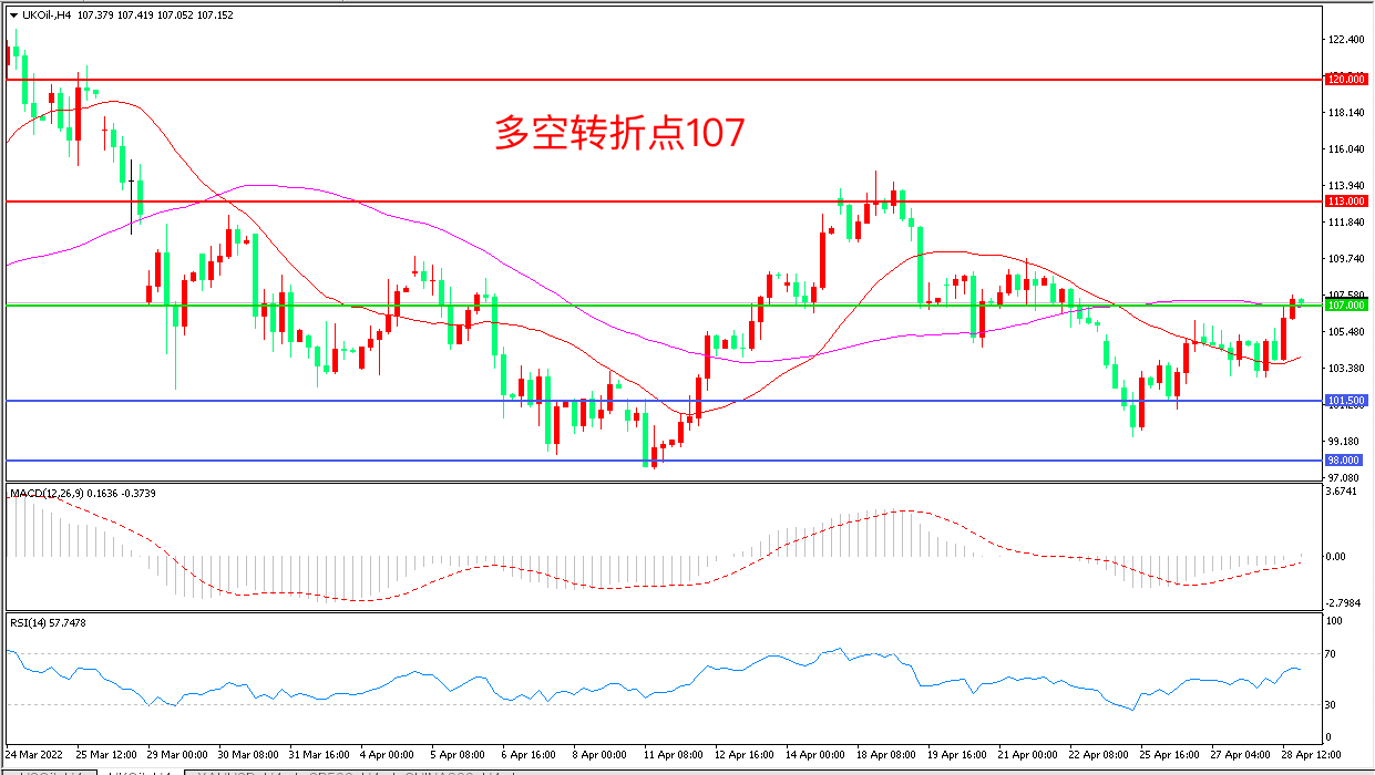 4小时图看,油价回踩21周前均线后长阳拉升,短线走势回暖,107美元成为多空分水岭,MACD红柱增加,RSI指标走平,日内震荡上行概率较大。