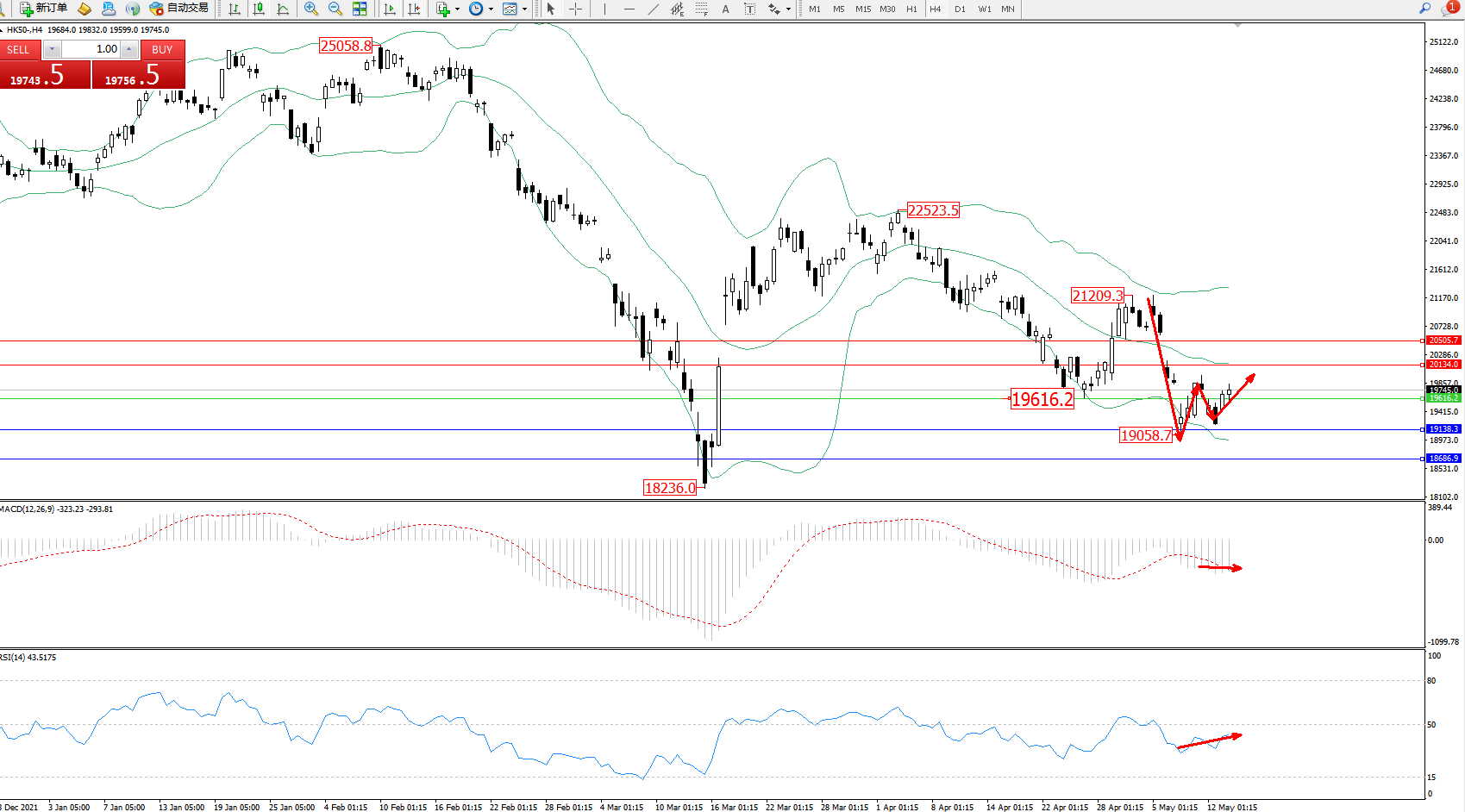 恒指HK50 ——4小时K线图显示: