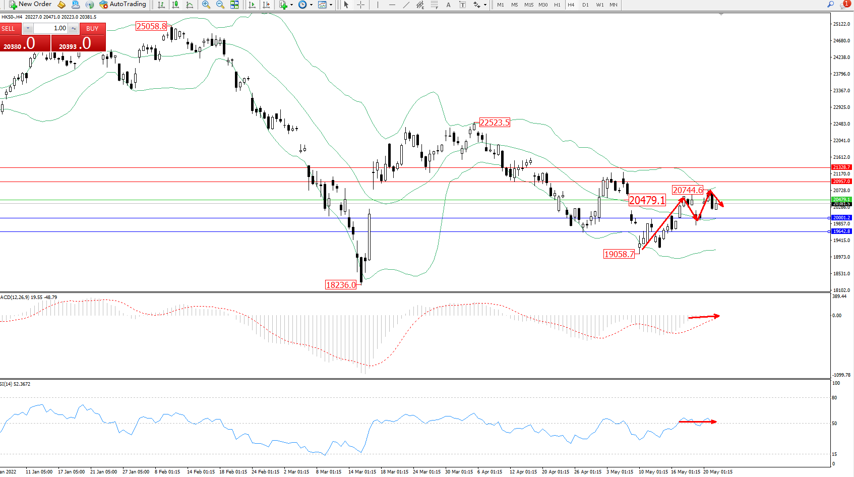 恒指HK50 ——4小时K线图显示: