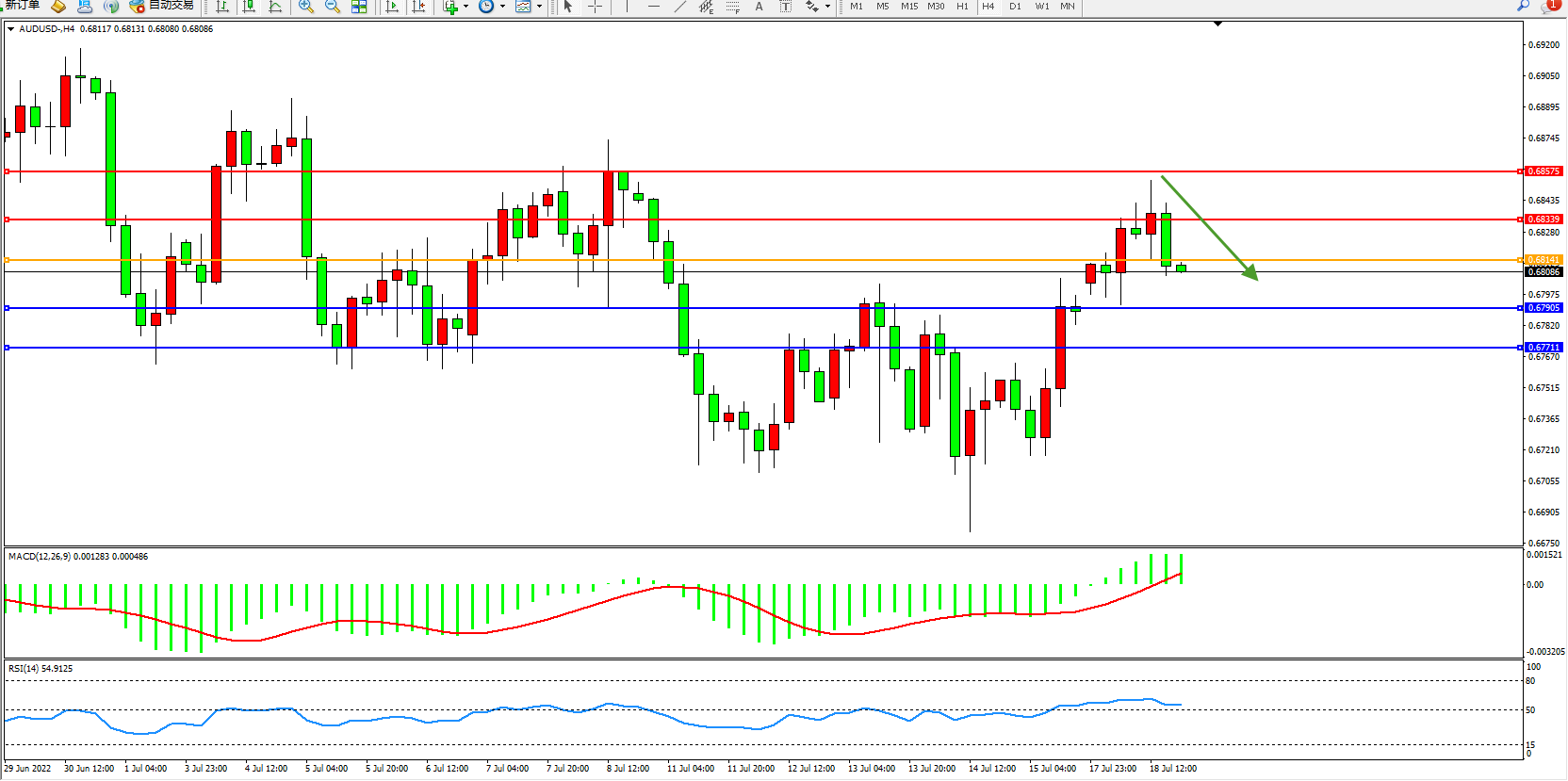 交易策略:0.68141下方看跌,目标0.67905、0.67711