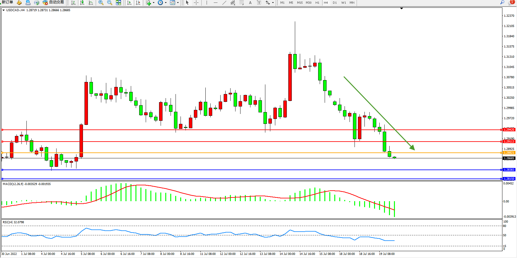 美元加元USDCAD——4小时K线图显示: