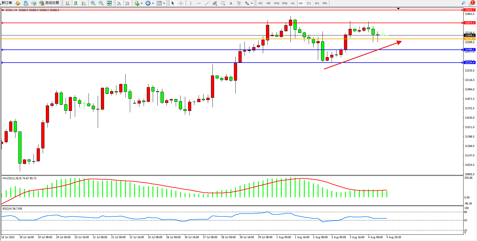 道琼斯指数DJ30——4小时K线图显示: