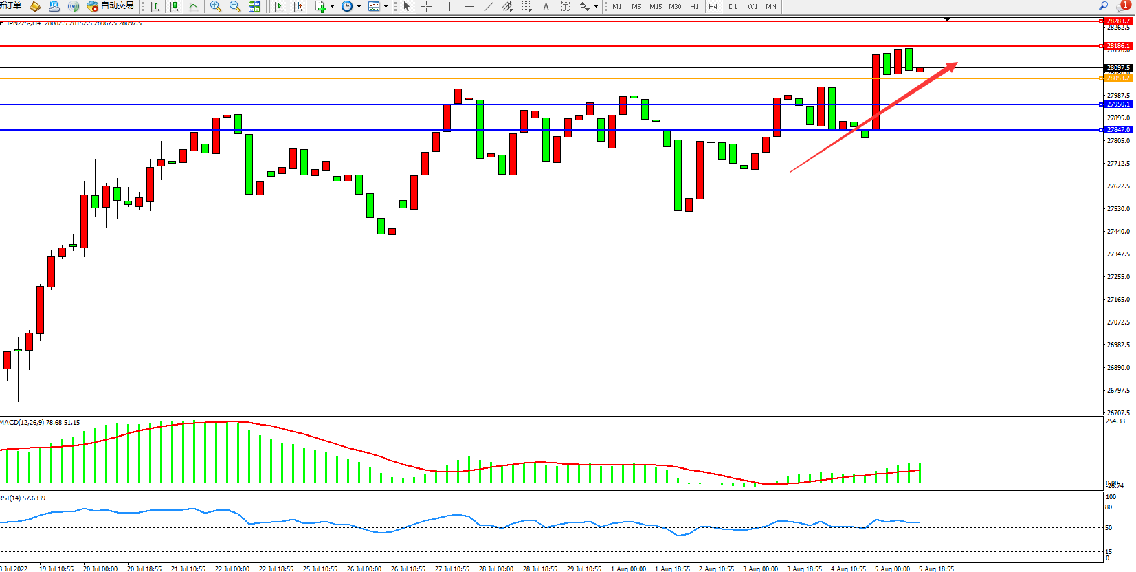 日经指数JPN225——4小时K线图显示: