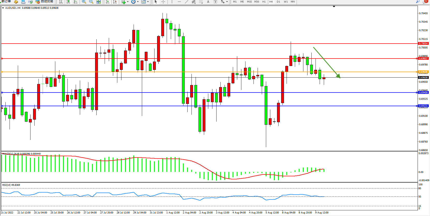 澳元兑美元维持0.69608附近震荡, 由于澳洲联储再次加息以及与生活成本飙升,一项衡量澳洲消费者信心的指标8月连续第九个月下跌,触及疫情初期以来的最低水平。